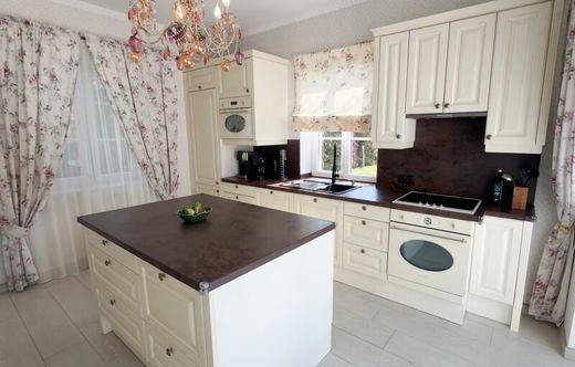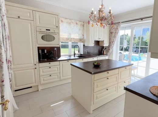 Das Wohnbereich geht in das Esszimmer über, das mit der Küche verbunden ist. Die Küche ist ein weiteres einzigartiges Merkmal dieses Hauses. Die helle, in weißen Tönen gehaltene, gemütliche Küche mit Blick auf den Innenhof wird der Traum jeder Hausfrau sein. Im Erdgeschoss finden Sie auch ein Gäste-WC und einen Zugang zur Garage, die Platz für zwei Fahrzeuge bietet, sowie eine Ladestation für Elektroautos.