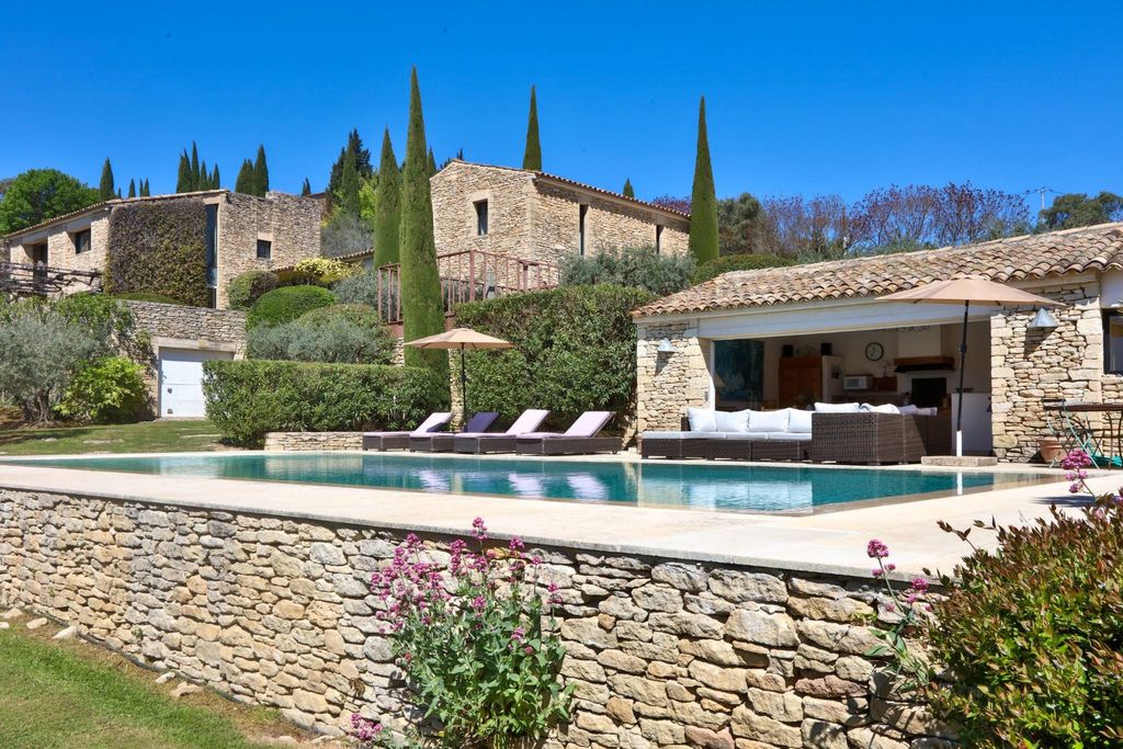 Renommierte Villa mit atemberaubender Aussicht auf den Luberon und Gordes. Ein exklusives Refugium im Herzen der Provence. Auf der Spitze der Hügel gelegen, in einer ruhigen und exklusiven Umgebung, bietet dieses prächtige 5575 m² große Anwesen ein außergewöhnliches Wohnerlebnis mit Panoramablick über das Dorf Gordes und das Luberon-Tal. Diese Villa ist ein seltenes Juwel in der Region und vereint Luxus, Komfort und natürliche Schönheit. Haupthaus – 337 m² raffinierte Eleganz. Das Haupthaus erstreckt sich über 337 m² (226 m² Wohnfläche ohne Garagen) und bietet geräumige, lichtdurchflutete Zimmer, die für optimalen Komfort und ein einzigartiges Wohnerlebnis konzipiert sind. Im Inneren drückt sich moderne Architektur durch klare Linien und hochwertige Materialien aus. Große Erkerfenster öffnen jedes Zimmer zu einer atemberaubenden Aussicht auf den Luberon und durchfluten jeden Raum mit natürlichem Licht. Drei elegante Schlafzimmer, jedes mit eigenem Bad en suite, darunter eine Master-Suite mit begehbarem Kleiderschrank, sind strategisch voneinander getrennt, um Ruhe und Privatsphäre zu gewährleisten. Zwei geräumige Wohnzimmer laden zum Entspannen ein und bieten gleichzeitig die atemberaubende Landschaft. Ein elegantes Esszimmer und eine offene, voll ausgestattete amerikanische Küche bieten den perfekten Rahmen für gemütliche Abende mit Familie und Freunden. Büros und eine Waschküche runden das Haus ab und bieten funktionale, gut gestaltete Räume für alle Ihre Bedürfnisse. Im Untergeschoss befinden sich ein Weinkeller sowie eine 38 m² große Garage für zwei Autos. Eine weitere, größere Garage mit 64 m² bietet Platz für drei weitere Fahrzeuge. Poolbereich und Poolhaus – eine Oase der Ruhe. Auch der Außenbereich des Anwesens ist spektakulär und besticht durch einen Spiegelpool aus Briare-Emaille (ca. 15 x 5 Meter) mit einem Unterwasserstrand, der nahtlos in den Horizont übergeht. Dieser außergewöhnliche Bereich ist von großzügigen Terrassen mit Panoramablick umgeben und eignet sich perfekt zum Entspannen in der Sonne oder für Mahlzeiten im Freien. Ein charmantes, voll ausgestattetes Poolhaus, das zum Pool hin offen ist, lädt Sie ein, die atemberaubende Aussicht auf den Luberon zu genießen. Externe Toiletten sorgen für zusätzlichen Komfort und praktische Entspannung am Wasser. Gästehaus – 131 m² Charme. Dieses vom Haupthaus getrennte, 131 m² große Gästehaus, zu dem auch das Poolhaus gehört, eignet sich ideal für die Beherbergung von Gästen. Es verfügt über zwei Schlafzimmer, ein lichtdurchflutetes Wohnzimmer mit Erkerfenster, eine Kochnische und ein eigenes Bad, damit Ihre Gäste einen komfortablen Aufenthalt in dieser zauberhaften Umgebung genießen können. Ein außergewöhnliches Grundstück – 5575 m² Olivenhaine. Das 5575 m² große, sanft abfallende Grundstück in Südlage ist ein wahres mediterranes Paradies mit fast 310 Olivenbäumen, die eine friedvolle und intime Atmosphäre schaffen. Ein wirklich privates Anwesen, das natürliche Schönheit mit provenzalischer Authentizität verbindet. Luxus, Gelassenheit und unverbaute Aussicht. Dieses Anwesen ist eine Einladung zum Entspannen, Nachdenken und Schwelgen in Luxus im Herzen der Provence. Der Panoramablick auf den Luberon, das Dorf Gordes und das Tal macht dieses Anwesen zu einem seltenen und außergewöhnlichen Fund. Genießen Sie Ruhe, Privatsphäre und ultimativen Komfort in einer der schönsten Regionen Frankreichs. Ein wahrer Traum: Diese Villa im Herzen der Provence lädt Sie ein, Ihre eigene Geschichte zu schreiben. Kontaktieren Sie uns, um eine private Besichtigung zu vereinbaren und dieses außergewöhnliche Anwesen kennenzulernen.