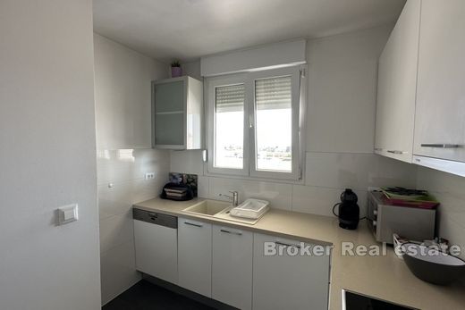 Großzügiges Penthouse mit drei Schlafzimmern, Whirlpool und Stadtblick in der Nähe der Mall of Split. Die Wohnung befindet sich im fünften Stock eines Wohn- und Geschäftshauses mit Aufzug und verfügt über zwei Garagenstellplätze. Sie bietet 72 m² Wohnfläche sowie zwei zusätzliche Terrassen mit insgesamt 185 m², von denen eine mit einem Whirlpool ausgestattet ist. Die Wohnung besteht aus Eingangsbereich, Essbereich, einem weitläufigen Wohnzimmer mit Zugang zur Terrasse, einer modernen Küche, Gäste-WC, Flur, Badezimmer und drei Schlafzimmern. Alle Schlafzimmer haben Zugang zur teilweise überdachten Terrasse mit Whirlpool und Essbereich, die einen weiten Blick über die Stadt und absolute Privatsphäre bietet. Alle Räume sind klimatisiert und funktional eingerichtet und garantieren einen komfortablen und angenehmen Aufenthalt. Die Wohnung ist hochwertig möbliert und in einem sehr guten Zustand. Sie wird derzeit erfolgreich als Ferienwohnung vermietet und bietet eine hervorragende Gelegenheit zur Langzeitvermietung, Ferienvermietung oder als schönes Familienheim. Die Lage der Wohnung bietet bequemen Zugang zu wichtigen Einrichtungen wie Bäckerei und Einkaufszentrum sowie eine schnelle Anbindung an die Hauptstraße Solin-Split. Trotz der zentralen Lage bietet die Wohnung eine ruhige und entspannende Atmosphäre, insbesondere auf der großen Terrasse mit Whirlpool, wo Sie absolute Privatsphäre und Luxus genießen können. Das Stadtzentrum und der Strand von Žnjan sind nur wenige Autominuten entfernt.