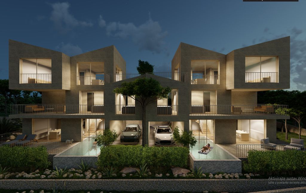 Eingebettet in einem prestigeträchtigen Teil der Insel Krk kombiniert diese moderne Villa nahtlos zeitgenössische Architektur, Komfort und beeindruckende Ausblicke. Entworfen für einen gehobenen Lebensstil, priorisiert die Residenz Geräumigkeit, Privatsphäre und Eleganz.