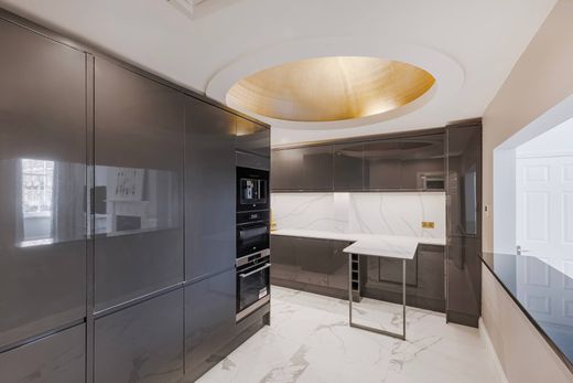 Diese wunderschön renovierte Wohnung im ersten Stock befindet sich in einem großen Gebäude mit weißer Stuckfassade. Hohe Decken mit aufwendigen Stuckarbeiten verstärken das Raumgefühl im offenen Empfangs- und Speisesaal, während große Schiebefenster den malerischen Ausblick auf die darunter liegende Thayer Street einrahmen. Parkettböden und ein handgeschnitzter Kamin verleihen diesem wunderbaren Empfangsbereich eine erhabene Atmosphäre. Die kürzlich renovierte, maßgefertigte Marmorküche ist mit eleganten grauen Schränken und erstklassigen AEG-Geräten ausgestattet. Eine Treppe führt auf eine private Dachterrasse mit weitläufiger Aussicht über Marylebone. Es gibt zwei Schlafzimmer, beide mit Holzboden. Ein neu renoviertes Marmorduschbad bietet Luxus in Hotelqualität und es gibt auch ein Gäste-WC. Die Wohnung ist mit dem Aufzug erreichbar. Hinde Street liegt perfekt im Herzen von Marylebone, nur wenige Minuten von den Boutiquen und Cafés der Marylebone High Street und den weltberühmten Geschäften der Oxford Street entfernt. Die grünen Freiflächen des Regent's Park sind leicht zu erreichen, ebenso wie die hervorragenden Verkehrsanbindungen, darunter die Bahnhöfe Bond Street und Baker Street, die eine schnelle Anbindung an das Zentrum Londons ermöglichen.