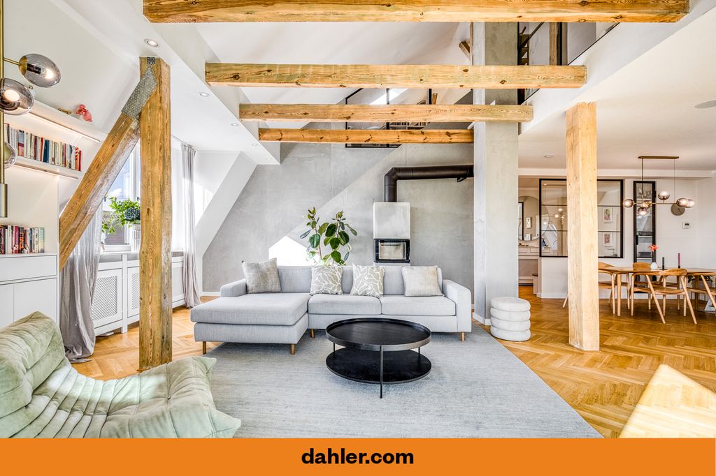 Diese außergewöhnliche Maisonette-Dachgeschosswohnung wurde 1984 auf einem repräsentativen Gründerzeitaltbau aus dem Jahr 1910 errichtet. Der historische Charme des Hauses – spürbar im Eingangsbereich und im originalen Aufzug – verbindet sich hier auf eindrucksvolle Weise mit modernstem Wohnkomfort.