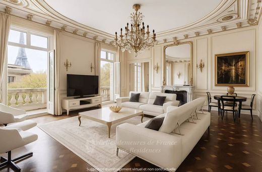 Eiffelturmblick – Empfangswohnung. In der Nähe der Place des États-Unis und des Palais de Chaillot, in einem repräsentativen Gebäude, besticht diese ca. 310 m² große Empfangswohnung vom ersten Moment an durch ihre elegante Galerie, die die Räume harmonisch miteinander verbindet. Der doppelte Empfangsraum, erweitert durch ein kleines Wohnzimmer, bietet über 80 m² lichtdurchflutete Fläche und öffnet sich zu einem nach Südosten ausgerichteten Balkon mit freiem Blick auf den Eiffelturm. Die Wohnküche vereint Ästhetik und Funktionalität und ist als eleganter und zugleich einladender Wohnraum gestaltet. Der Schlafbereich umfasst eine 56 m² große Master-Suite mit einem geräumigen, maßgefertigten Ankleidezimmer und einem Badezimmer (Badewanne, ebenerdige Dusche, Doppel-WC) sowie drei weitere Schlafzimmer, jeweils mit eigenem Duschbad und WC, die Komfort und Privatsphäre für alle Bewohner gewährleisten. Das gesamte Anwesen befindet sich in makellosem Zustand und besticht durch exklusive Annehmlichkeiten: integrierte Klimaanlage, maßgefertigte Möbel renommierter Designer wie Harrods (London) und Roche Bobois (Paris) sowie Leuchten aus Muranoglas (Italien). Zusätzlich zur Wohnung bietet das Anwesen ein 17 m² großes, separates Studio, ein 9 m² großes Dienstmädchenzimmer, einen 6 m² großen Abstellraum, zwei Kellerräume und einen Stellplatz im Innenhof. Ausrichtung: Südost/Nordwest. Eine seltene Gelegenheit auf dem Immobilienmarkt – Traumhafte Aussicht – Äußerst begehrte Lage.