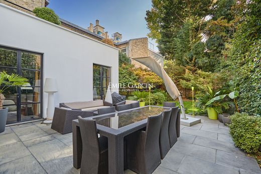 Seltenes und elegantes Herrenhaus in ruhiger, sonniger Lage mit Südostausrichtung. Gelegen in einer privaten und abgeschiedenen Straße, besticht dieses Anwesen durch seine großzügigen Proportionen, hohen Decken und einladenden Außenbereiche (Garten und Terrassen). Mit ca. 530 m² Wohnfläche, verteilt auf vier Etagen plus Keller und Garage, die alle bequem mit dem Aufzug erreichbar sind, bietet es ein komfortables und familienfreundliches Wohnambiente. Eine 42 m² große Terrasse, die in einen ca. 135 m² großen Garten übergeht, sowie eine zweite Terrasse im ersten Obergeschoss runden das Angebot ab. Aufteilung: Hochparterre: Eingangsbereich mit Garderobe und WC, doppeltes L-förmiges Wohnzimmer mit Zugang zu Terrasse und Garten, Esszimmer und große Wohnküche. Ein separates Zimmer mit direktem Straßenzugang kann als Büro genutzt werden. Erster Obergeschoss: Master-Suite, die die gesamte Etage einnimmt, bestehend aus einem Büro, einem großen Schlafzimmer mit Zugang zu einer Terrasse auf derselben Ebene (über dem Wohnzimmer), einem Badezimmer mit Ankleidezimmer und WC sowie einem Duschbad mit Ankleidezimmer und WC. Zweites Obergeschoss: Ein Schlafzimmer/Büro, ein Gästezimmer mit Duschbad und WC sowie eine separate Wohnung mit Wohnzimmer, offener Küche, Ankleidezimmer, Schlafzimmer und Badezimmer mit Dusche und WC. Drittes Obergeschoss: Waschküche und eine zweite separate Wohnung mit Wohn-/Esszimmer mit offener Küche, Kinderzimmer mit Bad und WC sowie Hauptschlafzimmer mit Duschbad und WC. Untergeschoss: Heimkino, Waschküche mit Zugang zum Garten, großer Weinkeller, Abstellraum, WC, Hauswirtschaftsraum und Platz für den Warmwasserbereiter. Garage für ein mittelgroßes Auto zwischen Untergeschoss und Erdgeschoss. Die private Villa ist vollklimatisiert (Heiz-/Kühlsystem) und verfügt über einen privaten Aufzug, der alle Etagen bedient. Drei Parkplätze in der privaten Auffahrt vor dem Haus sind im Preis inbegriffen. Drei weitere Parkplätze in der benachbarten Wohnanlage können separat erworben werden.