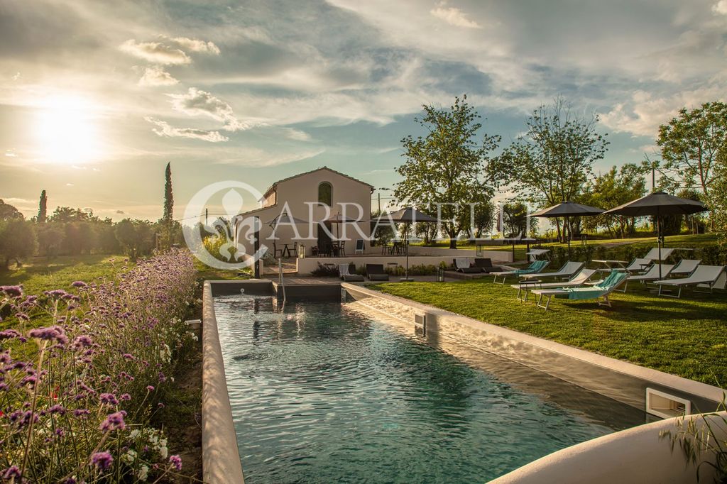 Im authentischen Herzen der toskanischen Landschaft, eingebettet zwischen sanften Hügeln und einer Landschaft, die wie handgemalt wirkt, liegt dieser raffinierte Weiler, der aus zwei sorgfältig restaurierten Bauernhäusern besteht, die nur wenige Meter voneinander entfernt sind. Das Anwesen besteht aus zehn fein eingerichteten Zimmern und einer unabhängigen Wohnung, die ein perfektes Gleichgewicht zwischen ländlichem Charme und modernem Komfort bieten. Jedes Zimmer hat seinen eigenen Charakter: sichtbare Balken, originaler Stein, Parkettboden und handwerkliche Details verleihen Wärme und Authentizität und schaffen ein elegantes und gemütliches Ambiente.