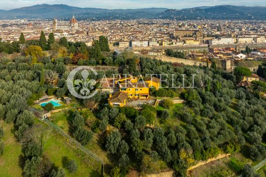 In einem der exklusivsten und begehrtesten Viertel Florenz, in der Nähe der historischen Stadtmauern und nur eine kurze Entfernung vom Forte Belvedere und Piazzale Michelangelo, befindet sich diese einzigartige Villa, eingebettet in die Ruhe des Grüns und dennoch sehr nahe am Stadtzentrum. Die Immobilie, etwa 600 qm verteilt auf mehrere Ebenen, besticht durch helle Räume, außergewöhnliche Panoramablicke und zeitlose Eleganz. Große Salons mit großen Fenstern blicken auf eine herrliche Terrasse, die Florenz überblickt, mit atemberaubendem Blick auf San Miniato al Monte und die wichtigsten Wahrzeichen der Stadt.