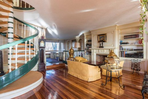 Auf der Hauptebene führt eine elegante Eingangshalle zu einem beeindruckenden Wohnzimmer mit zwei Zimmern und großen Fenstern mit Blick auf La Moraleja, einem separaten Esszimmer und einer großen Küche mit einem Büro sowie einem Personalzimmer mit komplettem Bad. Auf dieser Etage befinden sich auch eine Gästetoilette und eine herrliche, fast 20 m² große Terrasse mit Kamin, ideal für Treffen und Momente der Entspannung, sowie zwei weitere Terrassen von je 5 m².