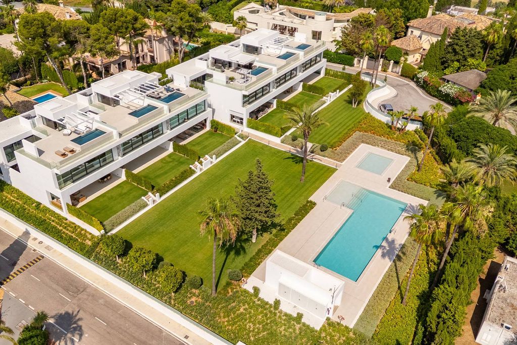 Das Anwesen präsentiert sich als zeitgenössische Doppelhaushälfte, gelegen in einer abgeschlossenen Wohnanlage in Nueva Andalucía, die einen Wohnkomfort bietet. Das Haus, fertiggestellt im Dezember 2023, erstreckt sich über vier Ebenen, die durch eine private Treppe miteinander verbunden sind, um einen reibungslosen Übergang zwischen den verschiedenen Bereichen zu ermöglichen. Mit einer Gesamtfläche von 612 m², davon 372 m² Innenfläche und großzügige Terrassen von insgesamt 240 m², legt die Architektur Wert auf die Integration von Innen- und Außenbereich. Die Südwestausrichtung ermöglicht es, reichlich Tageslicht und Panoramablick auf das Mittelmeer, La Concha und die Gegend von Puerto Banús zu genießen, dank der großen Fenster und bodentiefen Schiebetüren. Die Innenräume zeichnen sich durch einen schlichten und harmonischen Stil aus, mit Eichenholzböden, neutralen Farben und Bädern, die mit Porcelanosa-Marmor verkleidet sind. Die Hauptetage verfügt über ein offenes Wohn- und Esszimmer, das mit der Hauptterrasse verbunden ist, sowie eine designer Küche mit Gaggenau-Geräten. Die Villa bietet vier Schlafzimmer und fünf Bädern, mit drei Schlafzimmern im oberen Stockwerk und einem vierten Schlafzimmer im unteren Stockwerk, geeignet für Gäste, Fitnessraum oder Büro. Das Dachgeschoss verfügt über einen Plunge-Pool und ein Outdoor-Kino, und schafft damit einen idealen privaten Raum, um die Sonnenuntergänge zu genießen. Das Anwesen verfügt außerdem über drei Tiefgaragenstellplätze und Zugang zu Gemeinschaftsgärten sowie Gemeinschaftspool. Nueva Andalucía ist eine der begehrtesten Gegenden in Marbella, bekannt für ihr Wohnambiente, die Nähe zu Golfplätzen, internationalen Schulen, Restaurants und Geschäften sowie die Nähe zu Puerto Banús und den Stränden. Diese Umgebung vereint Ruhe, hochwertige Dienstleistungen und einen mediterranen Lebensstil, der von Einwohnern und Besuchern gleichermaßen geschätzt wird.