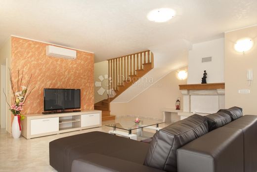 Dieses wunderschöne Haus liegt in ruhiger Lage nahe Poreč auf einem 593 m² großen Grundstück mit einer Wohnfläche von 140 m². Es erstreckt sich über ein Erdgeschoss und ein Obergeschoss und ist somit ideal für Familien oder alle, die ein ruhiges Leben am Meer genießen möchten. Im Erdgeschoss befindet sich ein geräumiges Wohnzimmer mit Zugang zur Terrasse – perfekt zum Entspannen und für gesellige Stunden mit der Familie. Angrenzend an das Wohnzimmer liegt die Küche, die viel Platz zum Kochen bietet. Ebenfalls im Erdgeschoss, links, befinden sich ein komfortables Schlafzimmer und ein modernes Badezimmer. Im Obergeschoss befinden sich zwei Schlafzimmer, eines davon mit Zugang zu einem Balkon mit atemberaubendem Meerblick. Außerdem gibt es hier ein zweites, luxuriös ausgestattetes Badezimmer. Das Haus verfügt über eine Klimaanlage für angenehme Temperaturen, und im Wohnzimmer sorgt ein Kaminofen für wohlige Wärme und eine gemütliche Atmosphäre in den kälteren Monaten. Der Außenbereich umfasst einen 24 m² großen Pool, ideal zum Sonnenbaden und Entspannen. Neben dem Pool befinden sich Außenduschen für zusätzlichen Komfort. Das Haus verfügt über eine automatische Bewässerungsanlage, die die Gartenpflege erleichtert. Zwei Parkplätze befinden sich direkt am Haus. Diese Immobilie bietet alles, was man für ein komfortables und entspanntes Leben in ruhiger Umgebung benötigt, und liegt gleichzeitig in der Nähe aller Annehmlichkeiten von Poreč und der Küste. Sie ist ideal für Familien oder alle, die die Schönheit des Lebens an der Adria genießen möchten.