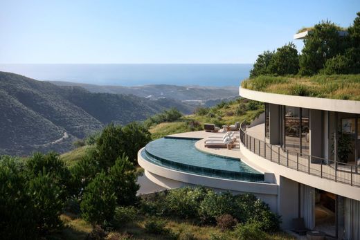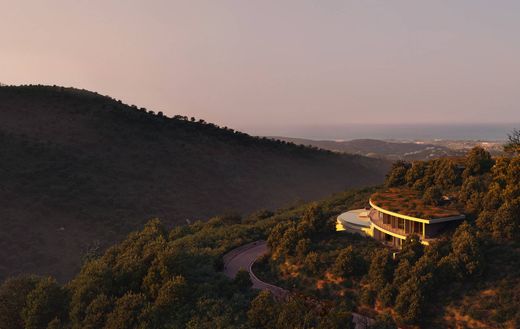 Eingebettet in die Hügel von Monte Mayor, verbindet dieses architektonische Meisterwerk modernste Gestaltung mit der Schönheit der natürlichen Umgebung. Die geschwungene Architektur fügt sich harmonisch in die Landschaft ein und bietet einen ungestörten Blick auf das Tal, das Mittelmeer und das üppige Grün des Naturschutzgebietes.