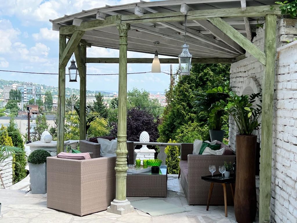 Geschlossene, überdachte, beheizte und ganzjährig nutzbare Veranda; Zimmer mit Küche; Badezimmer; angeschlossene Panorama-Weinterrasse auf etwa derselben Höhe wie die Freiheitsstatue am Gellértberg mit vollem Rundumblick; offene, überdachte Zigarrenterrasse.