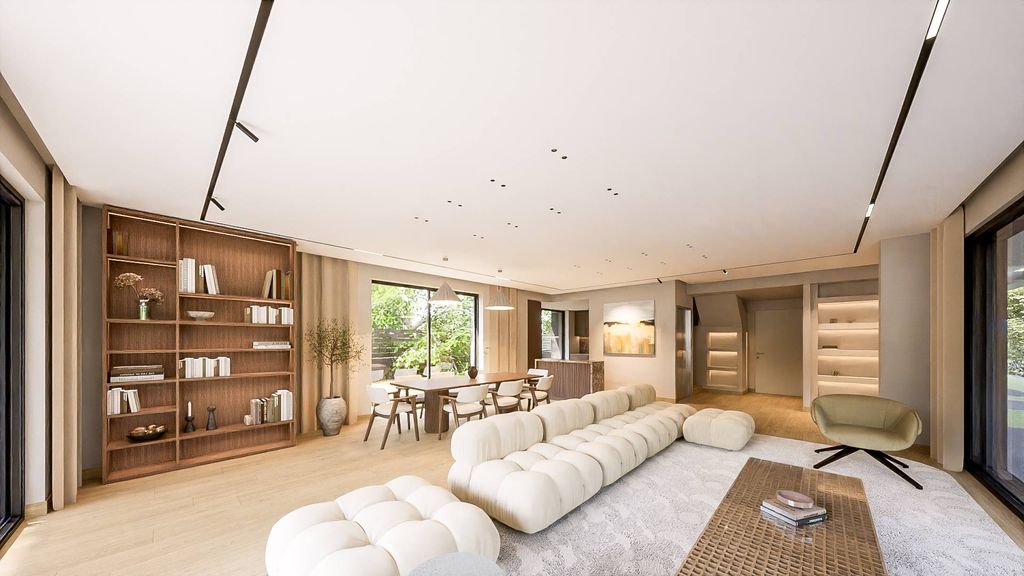 Στον επάνω όροφο, τρία κομψά επιπλωμένα υπνοδωμάτια περιλαμβάνουν μπάνια en-suite, ενώ η κύρια σουίτα διαθέτει ευρύχωρη διαρρύθμιση και walk-in ντουλάπα, μια μελετημένη συγχώνευση ιδιωτικότητας, χώρου και σύγχρονης εξευγένισης.