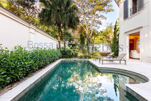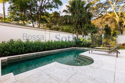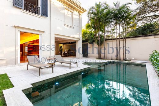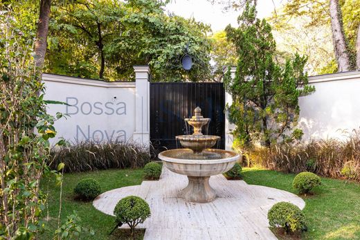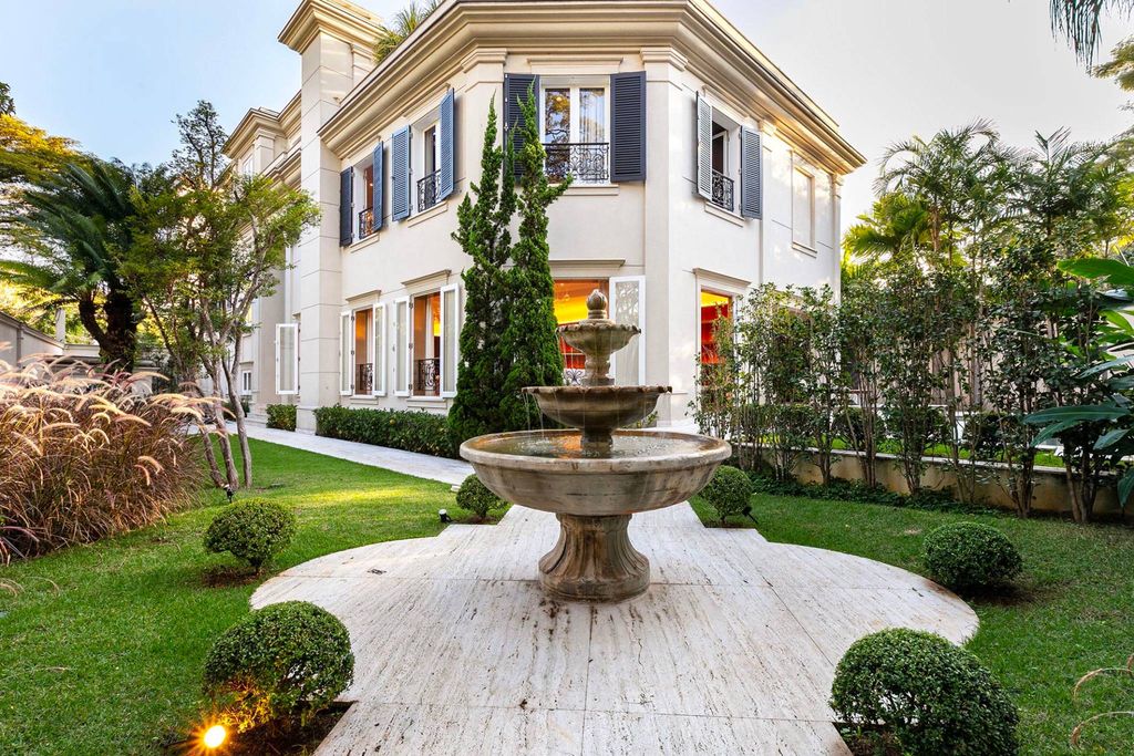Casa ecológica de estilo neoclásico diseñada por Israel Rewin y tecnología de Healthy Home Innovation. Justo en la entrada hay una fuente de agua y un jardín, seguido de una piscina con azulejos verdes de sukabumi y un espacio gourmet con barbacoa de gas LYNX, placa de inducción, cava de vinos y minibar V-Lin. El hall de entrada tiene techos de doble altura, suelo de mármol Sivec y paredes acolchadas de tela; esta zona se abre a un salón con revestimiento de paredes de nogal alto brillo, rodapié y zócalo con acabado metálico bronce cepillado, estantes de cristal, elegante iluminación de techo y chimenea de mármol Sivec blanco. El comedor cuenta con paneles de espejo y una obra de arte retroiluminada en el techo. Hay un segundo comedor con revestimientos de paredes de nogal alto brillo y estantes iluminados. La cocina también tiene revestimiento de madera de alto brillo, además de estar completamente equipada con electrodomésticos europeos Viking y Gorenje, así como un mueble invernadero para verduras y frutas. El suelo y las encimeras de toda la zona de servicio, incluida la cocina y la despensa, son de cuarcita Matira. También hay un baño y una oficina. En el segundo piso hay una sala familiar con una unidad de entretenimiento con un cajón refrigerado y un horno de microondas, así como revestimientos de paredes de madera y un nicho para obras de arte. En el área de dormir hay cuatro dormitorios con baños en suite de mármol Sivec y armarios. El dormitorio principal es espacioso y tiene revestimientos de paredes de madera, un cabecero de mármol negro y un mueble de TV con aire acondicionado incorporado, así como un armario con revestimientos de madera, cuero y vidrio de Marcenaria Fenix, y un baño His and Hers con piso de mármol Paraná, lavabo y bañera tallados, asiento inteligente Panasonic, ducha de techo, ducha lateral, metales alemanes Hansgrohe en bronce cepillado, ducha de vidrio extra claro, espejo antivaho con iluminación y toallero calefaccionado. En el tercer piso hay otra sala de estar con un acabado de pared de madera y una configuración de cine en casa que comprende un mueble de TV de 85 pulgadas con ónix retroiluminado. En el exterior hay otra área gourmet con un deck de madera, una parrilla de barbacoa de carbón, una chimenea al aire libre y un jardín. También cuenta con bañera de hidromasaje, sauna seca, baño, balcón privado y espacio para gimnasio. El garaje subterráneo cuenta con sistema de seguridad en la puerta y rampa en pendiente para Lamborghini y Ferrari, con espacio para estacionar 10 autos. Hay dos instalaciones para empleados con cocineta y baño, y una habitación para conductores con baño. La casa también cuenta con paneles solares y un exclusivo sistema patentado de purificación iónica, purificador de agua Clean Sui Mitsubishi, que elimina pesticidas, metales pesados y controla el pH del agua. El consumo de agua se reduce a través de un sistema de recirculación de duchas y el agua caliente se suministra al instante, evitando el desperdicio. También hay un ascensor de acero inoxidable que llega a todos los pisos, sistema de aspiración central, automatización total de cortinas, internet, iluminación Piero, aire acondicionado central Daikin, cerraduras digitales, riego para los jardines suspendidos y verticales, cámaras con monitoreo remoto vía celular, seguridad con sistema de cierre, puertas blindadas y cámaras con inteligencia artificial.
