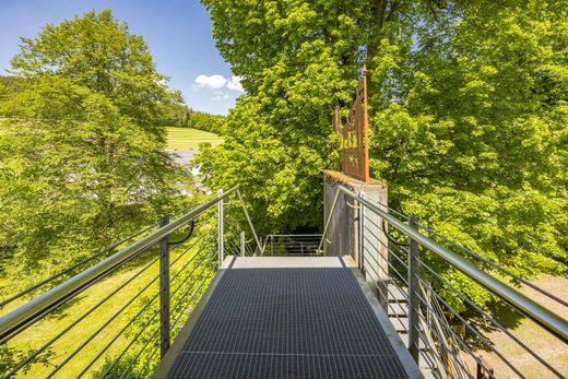 El castillo consta de un edificio alargado de dos plantas con tejado a cuatro aguas y una extensión en ángulo. La planta baja presenta techos abovedados y capiteles bohemios que datan de alrededor de 1705, mientras que la planta superior alberga dos impresionantes y espaciosas salas de estuco, también de alrededor de 1705. La armadura del techo, inacabada y de la misma época, consiste en un techo de vigas con una armadura de doble viga collar. En el sótano hay dos bóvedas de cañón, conectadas por un arco, probablemente del período gótico. El castillo impresiona especialmente por su ambiente acogedor y su atmósfera evocadora. El clima interior es muy agradable gracias al gran espesor de los muros, y las vistas a prados y bosques crean imágenes muy evocadoras. El castillo ofrece un gran potencial, tanto para el trabajo artístico como para la creación, con numerosas posibilidades de exposición, así como para trabajar y vivir bajo un mismo techo. La convivencia con una familia numerosa durante varias generaciones también es ideal en el castillo. El hermoso jardín consta de un huerto con árboles frutales antiguos y un jardín barroco con magníficas flores, que fue diseñado con cariño en 2001. El castillo se encuentra en un buen estado, modernizado y renovado.