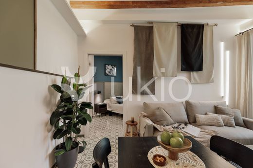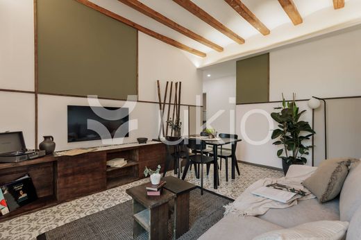 La sencilla y geométrica decoración en madera complementa las vigas de madera del techo, una característica típica de la arquitectura catalana. El salón dispone de un mueble a medida situado bajo el televisor y de un jardín zen de inspiración japonesa. Las mesas del comedor y de la cocina están realizadas combinando madera con ladrillos, logrando así una sincretización de lo rústico y lo industrial.
