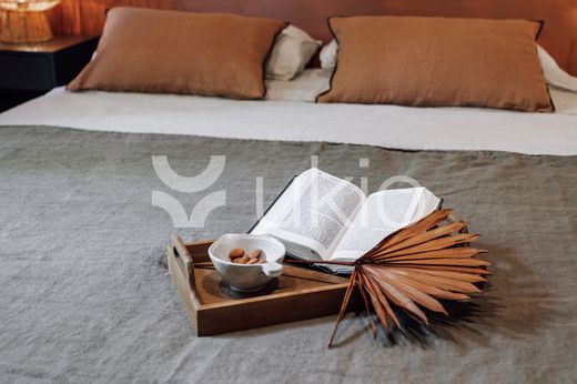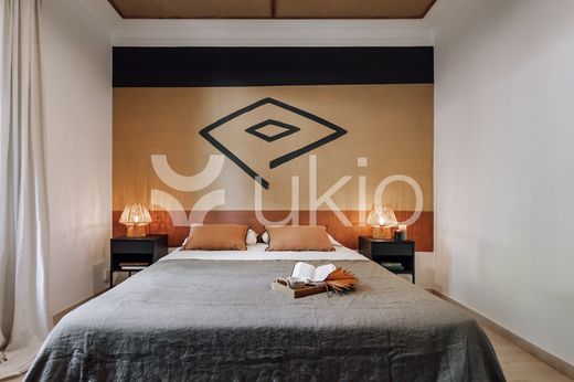 La puerta más cercana a la cocina conduce al primer dormitorio de Zioba, cuyo techo en fibra natural complementa la pieza artística, artesanal y personalizada que acompaña la cama de matrimonio. Superado el espacio de almacenamiento encontrará el acceso al primer balcón, que le brindará vistas a las bulliciosas calles de Barcelona.