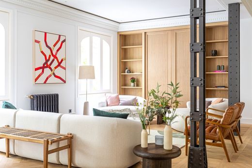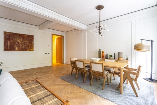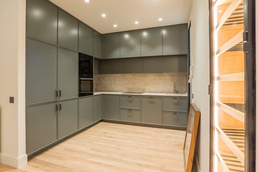 La zona de estar está compuesta por un amplio salón doble con tres ventanales, que llenan de luz natural el espacio durante todo el día. La zona de comedor está perfectamente integrada, y la cocina independiente está equipada con electrodomésticos de gama alta y armarios a medida, una verdadera joya para los amantes de la cocina. Cuenta con zona de lavandería independiente, Cabe destacar la cuidada carpintería, La cocina es semi-incorporada y tiene una lavandería independiente, equipada con lavadora y secadora, espacio de plancha y tendedero. Los techos son altos, hay molduras de pared y techo, suelo de roble en