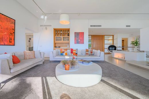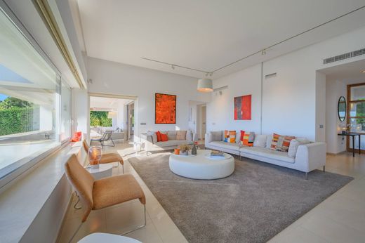 Diseñada con elegancia contemporánea, la villa dispone de seis amplios dormitorios, seis baños y una suite independiente para el servicio con baño privado. Los interiores están llenos de luz natural, realzados por techos altos y grandes ventanales que crean una sensación de amplitud en todo el espacio. La distribución incluye un hall de entrada, un luminoso salón con chimenea que se abre a una terraza cubierta, un comedor independiente, una cocina moderna totalmente equipada con isla central y terraza con barbacoa, así como una sala de televisión con chimenea, biblioteca y una oficina.