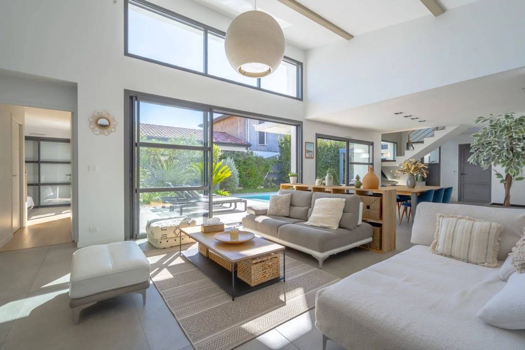 Con una ubicación ideal en el corazón del distrito de los Cinco Cantones, cerca de las playas y del campo de golf de Chiberta, en una tranquila calle sin salida, esta magnífica casa, diseñada por un arquitecto en 2018 y ofrecida en coexclusiva, ofrece servicios de alta calidad. Con una superficie aproximada de 200 m² y ubicada en una parcela de 575 m², dispone de cuatro dormitorios, incluyendo una suite principal en una sola planta. Un garaje, una piscina climatizada y una caseta de piscina completan esta propiedad. Su ubicación privilegiada y tranquila le permite disfrutar plenamente de un estilo de vida a poca distancia. En la planta del jardín, la entrada, equipada con trastero, conduce a un amplio salón, bañado de luz gracias a sus grandes ventanales orientados al sur. El salón y el comedor se abren a una gran terraza con acceso a una piscina de agua salada de 8 m x 3,5 m. La cocina semiabierta, acompañada de un lavadero, amplía este acogedor espacio. Una suite principal con vestidor y baño con ducha completa esta planta. Una cocina de verano, al igual que un patio de 27 m², permite disfrutar plenamente de los días soleados. En la planta superior, tres cómodos dormitorios comparten un baño con ducha, un baño completo y un aseo. Un garaje y plazas de aparcamiento exterior completan esta excepcional casa. Situada en un entorno tranquilo, pero en pleno centro, seduce por su ubicación privilegiada, su diseño moderno y sus acabados de alta gama. Estado de riesgo y contaminación: cumplido (nulo).