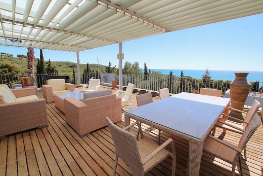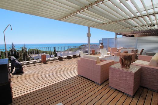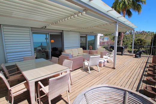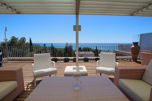 Exclusividad y vistas al mar en Casas del Mar!~~Déjate cautivar por esta espectacular propiedad de 232 m² situada en la codiciada urbanización Casas del Mar, una de las zonas residenciales más prestigiosas de la costa. Rodeada de naturaleza, a pocos pasos de los colegios internacionales Lycée Bel Air, Olive Tree y Richmond, y con vigilancia las 24 horas, esta vivienda ofrece un entorno seguro, privado y tranquilo, ideal para familias que buscan calidad de vida.~~Distribuida en tres cómodas plantas, esta casa destaca por su amplitud, luminosidad y vistas despejadas al mar.~~� Planta principal (nivel calle):~Al entrar, te recibe una habitación doble con salida a una terraza privada actualmente habilitada como gimnasio. En esta misma planta se encuentra un baño completo con plato de ducha, una amplia cocina office completamente equipada (con vitrocerámica, campana decorativa, nevera americana y lavadero), y un luminoso salón-comedor con salida directa a una terraza de 60 m² con impresionantes vistas al mar, perfecta para comidas al aire libre o momentos de relax.~~� Planta superior:~Aquí se encuentra la suite principal, un espacio íntimo y elegante que cuenta con baño privado con ducha, vestidor y acceso a una terraza de 38 m² con espectaculares vistas, ideal para desconectar al final del día.~~� Planta inferior:~Un verdadero plus de esta propiedad: un apartamento-estudio independiente con su propio baño completo, una gran bañera con jacuzzi, una amplia zona de vestidor y un cómodo office con lavavajillas y nevera. Desde aquí se accede directamente al parking (5 plazas incluídas en el precio), aportando máxima funcionalidad y privacidad.~~� Detalles que marcan la diferencia:~– Armarios empotrados~– Aire acondicionado con bomba de calor~– Terrazas revestidas en madera~– 5 Plazas de aparcamiento incluídas en el precio!~– Urbanización con piscina comunitaria y vigilancia 24h~~Esta vivienda es un auténtico capricho mediterráneo, perfecta para quienes valoran el confort, el diseño y las vistas inigualables al mar. Una propiedad para disfrutar todo el año en un entorno residencial de alto nivel. ¡Ven a descubrir tu próximo hogar! ~~El precio de la oferta puede modificarse o cancelarse sin previo aviso. Todos los datos presentados son puramente indicativos.