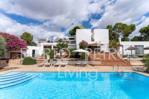 In a quiet street only for residents, this unique villa is located on a considerably spacious plot of land - just a 2-3 minutes walk away from the picturesque marina of Porto Petro. From here you can easily reach the restaurants and all other amenities of the harbor promenade, such as cafes, bars and supermarkets. In addition to its desirable location the villa impresses with its fascinating atmosphere created by the sophisticated combination of geometric-modern architecture using traditional mallorcan materials such as Santanyi stone and local clay tile flooring. You enter the villa via a vestibule from which you have access to the spacious living room with dining area, reading and music corner. Eye-catchers are the large brick seating furniture and the modern, free-standing fireplace in the center of the room as well as the fantastic views over the garden terrace towards the paradisiacal, mature garden with spacious pool. The high sliding windows towards the terrace disappear into the walls when opened, while the playful pattern of the floor tiles continues outside - it seems as if the outside and inside spaces merged almost seamlessly. Adjacent to the living room there is a separate kitchen with a practical pantry as well as an additional cozy lounge, semi-open, with a small outdoor kitchen, a built-in fireplace for colder winter evenings, a television and, again, fantastic views and access to the beautiful garden with pool. A master bedroom with bathroom en suite is also located on the ground floor and therefore it offers its own terrace area in the garden. On the upper floor you will find additional four bedrooms and two bathrooms. Special highlight is a very spacious terrace with brick barbecue from which you can enjoy wonderful sea views. Basically, the villa offers plenty of sun all day and all year round thanks to its various terraces, spread over the different floors and levels as well as the different areas of the plot. Outside the main house, in a ground-level extension, there is a sixth bedroom and a fourth bathroom - making the villa a true gem in Porto Petro as houses of this magnitude with this number of rooms are scarce in this charming locality.