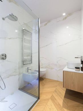 Baño moderno con ducha walk-in y sanitarios suspendidos.