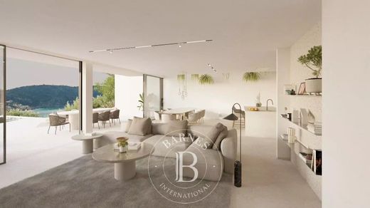 La villa se extiende en tres niveles, conectados por un ascensor privado, con aproximadamente 547 m2 de espacio habitable elegante. El salon y comedor de planta abierta se abren directamente a amplias terrazas, proporcionando una vida interior-exterior fluida, mientras que una chimenea agrega calidez y estilo. Cuatro dormitorios, cada uno con bano privado, ofrecen confort y privacidad, y el diseno incorpora materiales naturales como piedra y vidrio para una estetica contemporanea y armoniosa.