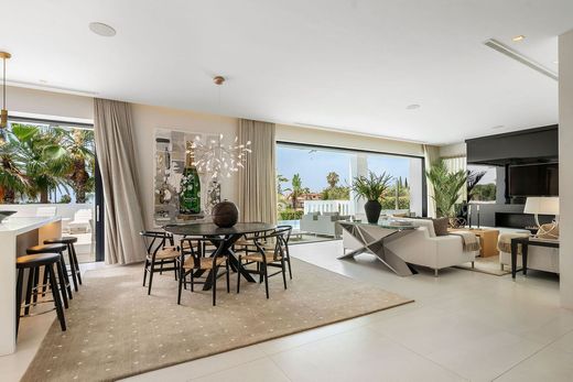 Impresionante villa moderna de lujo en Nagüeles, en la Milla de Oro de Marbella, con fácil acceso al centro de Marbella y a solo 10 minutos en coche de Puerto Banús. La propiedad está construida con las más altas calidades, con gran atención al detalle y utilizando materiales e instalaciones de primera calidad. La villa se distribuye en tres plantas, todas conectadas por ascensor, incluyendo un sótano y una amplia terraza solárium en la azotea. El sótano incluye garaje privado con plataforma giratoria, zona de entretenimiento con sala de TV, un amplio bar, salón, un amplio dormitorio para el personal/invitados con baño en suite, lavadero, aseo de invitados y cuarto técnico. La planta de entrada consta de recibidor, aseo de invitados, un dormitorio en suite, un amplio salón-comedor y una cocina abierta con acceso a la gran terraza que da a la piscina privada. El dormitorio principal se encuentra en la primera planta e incluye un amplio baño en suite y vestidor. Esta planta también incluye un dormitorio en suite adicional. La terraza de la azotea de 98 m² ofrece vistas panorámicas al mar y a la montaña y es ideal para el entretenimiento al aire libre. También incluye una zona de relax, un baño y trastero.