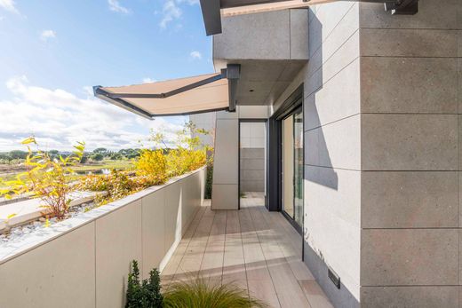 En la planta principal, un elegante y luminoso salón-comedor se abre a una amplia terraza con vistas directas al campo de golf, creando un entorno ideal tanto para el descanso como para el entretenimiento. La cocina, completamente equipada con electrodomésticos de alta gama, dispone de zona de aguas y tendedero. Esta planta se completa con un aseo de cortesía y una habitación de servicio con baño en suite.