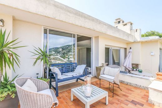 Dans un petit domaine privé situé sur les hauteurs de Villefranche-sur-Mer, un appartement, au dernier étage d’une villa divisée en deux appartements, offrant une belle vue sur la rade de Villefranche. Ce 3 pièces d'environ 90 m² composé d'un salon avec cheminée, une salle-a-manger, une cuisine séparée. Le séjour donne sur la terrasse de 50 m² d'où l'on peut admirer a une très belle vue sur la mer ainsi que sur la baie de Villefranche et Saint Jean Cap Ferrat, 2 chambres, un WC d'invités, une véranda et une salle d'eau avec WC. Le quartier est très calme et résidentiel à proximité des commerces, arrêt de bus et des écoles. Plusieurs places de parking. A seulement 25 minutes de l'aéroport et moins de 10 minutes du centre-ville de Nice