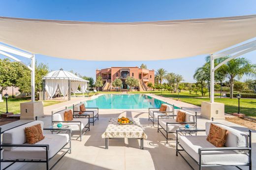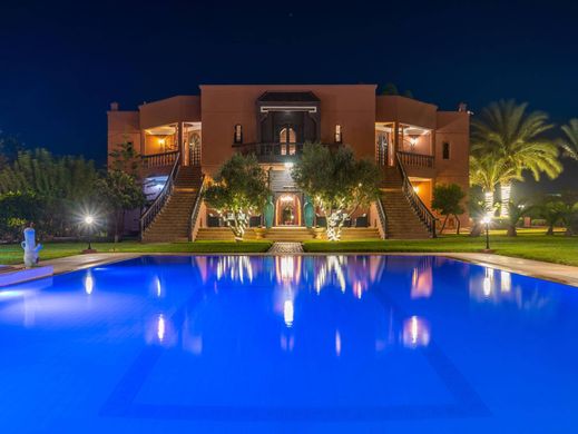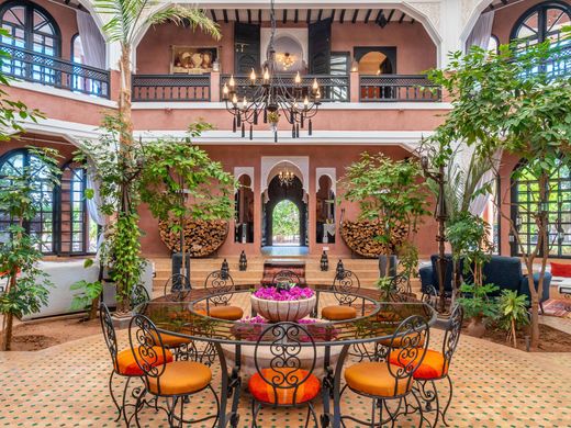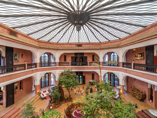 Située sur un terrain d'un hectare, à 20 minutes de Marrakech, sur la route de l'Ourika au sud de Marrakech, cette maison de style marocain abrite 2 bâtiments autour d'une piscine chauffée. La maison principale est composée de trois étages. Le cellier sert d'espace technique et de rangement. Le rez-de-chaussée est construit autour d'un grand patio arboré qui sert de salles de réception. On y trouve également la cuisine, ainsi qu'une chambre avec sa salle de bains. Le premier étage comprend six chambres avec chacune leur propre salle de bains. La deuxième batisse résidentielle, qui se trouve de l'autre côté de la piscine à l'arrière de la maison principale, offre beaucoup d'espace d'accueil et de bien-être ainsi qu'un vaste bureau qui peut être aménagé en chambre, en plus de deux autres chambres avec leur salle de bains. Toutes les pièces de la propriété sont climatisées mais grâce à l'ouverture de certaines fenêtres du bâtiment principal, le grand patio nécessite rarement l'utilisation de la climatisation. Autres : logement des employés, puits, climatisation réversible. La route de l'Ourika quitte Marrakech vers le Sud en direction de la luxuriante vallée de l'Ourika et de la station de sport d'hiver de l'Oukameiden. Pour plus d’information, veuillez contacter Franck LE PÉCULIER au +212 6 63 15 92 44.
