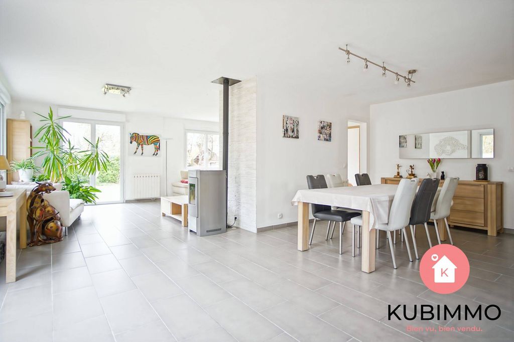 Description : Entrée qui donne sur une belle pièce de vie de 55m² exposé Sud et Ouest offrant un système de chauffe avec un poêle à granules. Une cuisine indépendante entièrement aménagée et équipée. une chambre en RDC, un dégagement qui dessert une salle de bains, un WC, le garage. Escalier d'accès à l'étage. Jardin