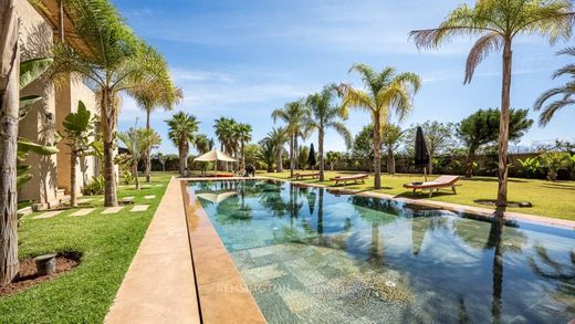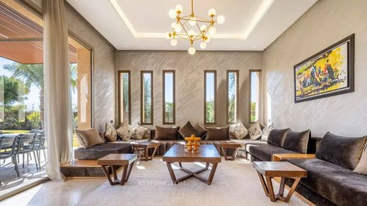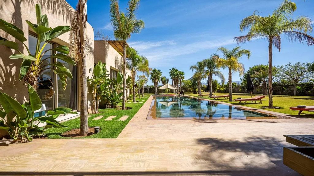 L'entrée dessert une belle réception avec cheminée centrale, une salle à manger avec cuisine US équipée, 3 suites au rdc avec chacune sa salle de bains, un bureau et un stockage. Au 1er étage deux chambres dont une suite parentale avec dressing, salle de bains et terrasse privative. Un escalier extérieur mène à un roof top aménagé pour contempler les couchers de soleil et les monts de l'Atlas. Une tente saharienne autour de la piscine en pierre de bali.