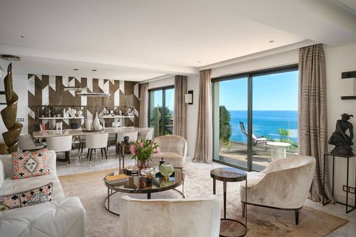 Nichée dans un domaine sécurisé 24h/24 et 7j/7, cette exceptionnelle maison de ville en bord de mer offre un cadre de vie inégalé avec des vues panoramiques spectaculaires sur la mer. Répartie sur trois niveaux, elle dispose d'une entrée privée, d'un ascenseur et d'une piscine privée. La somptueuse suite principale s'ouvre sur une vaste terrasse, tandis que les élégants espaces de vie et de réception donnent sur des terrasses baignées de soleil avec une cuisine extérieure. Trois autres chambres en suite bénéficient d'un accès direct à un jardin privé. Parmi les prestations exclusives : un funiculaire menant directement au bord de mer, une piscine aux dimensions quasi-olympiques, des jardins paysagers et une plage privée avec ponton. Idéalement située à quelques minutes de Nice et de Villefranche-sur-Mer.