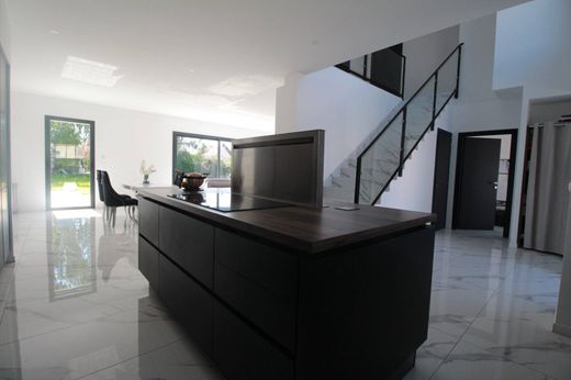 Vous trouverez au RDC, une belle entrée cathédrale donnant sur la cuisine aménagée et équipée de très bonne facture. Le séjour salon de 50 m² est très lumineux grâce à plusieurs baies vitrées exposées Sud et Ouest. Au RDC vous profiterez d'une piscine couverte et chauffée (PAC) de 6 x 3 pour 1m50 de profondeur et aurez le plaisir d'avoir un sauna à disposition dans cette même pièce de 50m².
