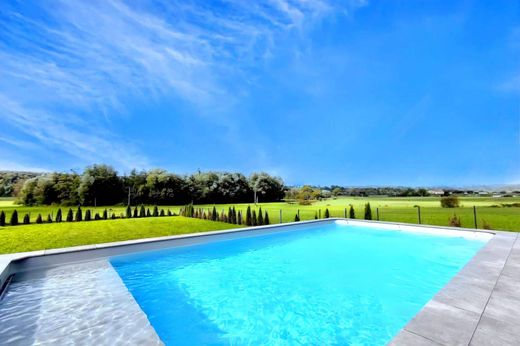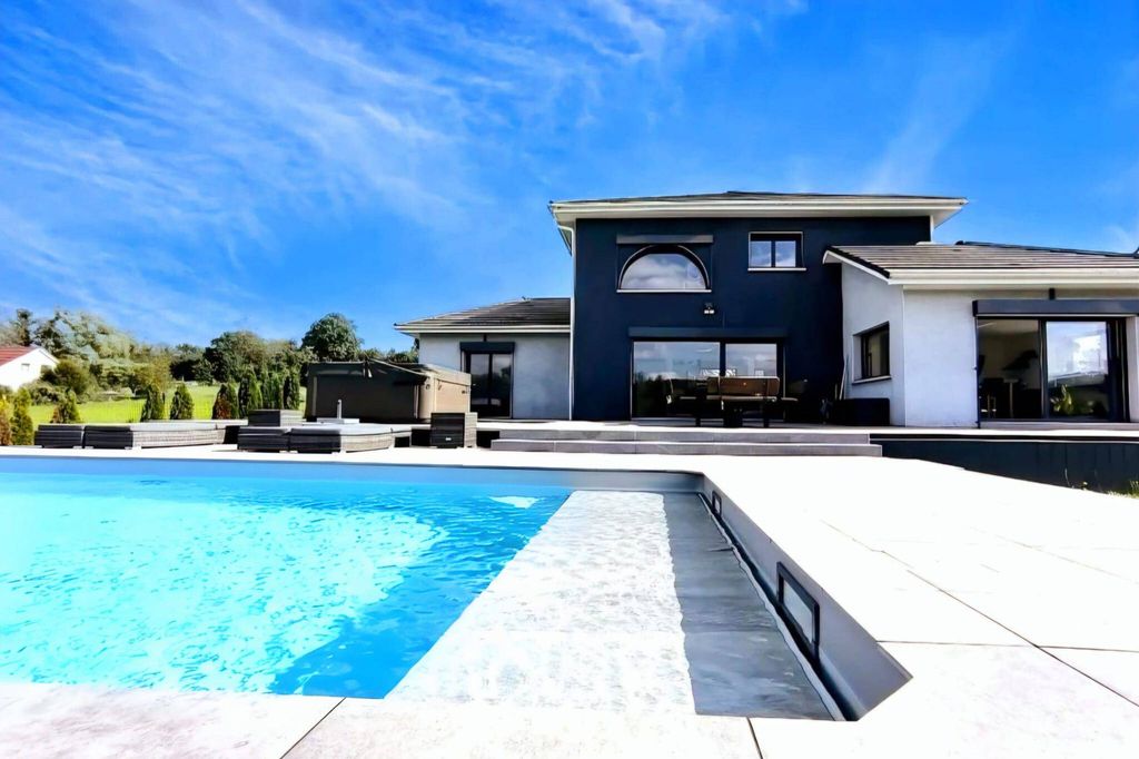 Le salon-séjour, sublimé par de larges baies vitrées offrant une sensation permanente d'intérieur / extérieur , s'ouvre sur une terrasse orienter en plein sud et un jardin paysager, proposent une vue dégagée sur la campagne environnante et les collines Suisse.
