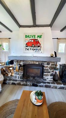 Grande pièce de vie lumineuse avec poutres apparantes et cheminée en pierres, accès à sa grande terrasse de 24M², idéal pour les beaux jours entre amis.