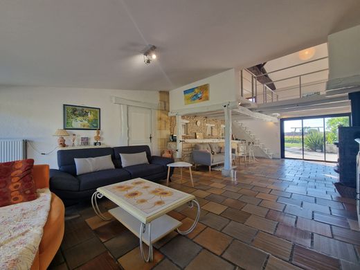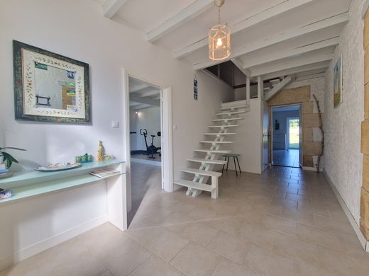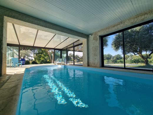Entre JONZAC et MONTENDRE (17) - Dans un environnement calme, sans voisin immédiat, cette ancienne longère rénovée en 2021 offre de beaux volumes avec lumière traversante en parfait état sur un terrain arboré de 4 674 m2. La maison principale est parfaite pour les familles nombreuses. Entrée, cuisine équipée, beau séjour avec mezzanine qui profite d'un poêle à bois, salle de sport, piscine intérieure avec de grandes ouvertures sur l’extérieur, arrière-cuisine et cave. L'étage distribué par un palier, se compose de cinq chambres dont suite parentale avec salle d'eau et dressing. Seconde maison de plain-pied attenante. Séjour avec deux grandes baies vitrées et insert, cuisine équipée ouverte sur un salon, salle d’eau et chambre. Grand garage attenant. Cette propriété de charme offre un cadre de vie remarquable.