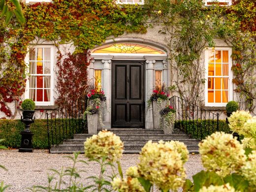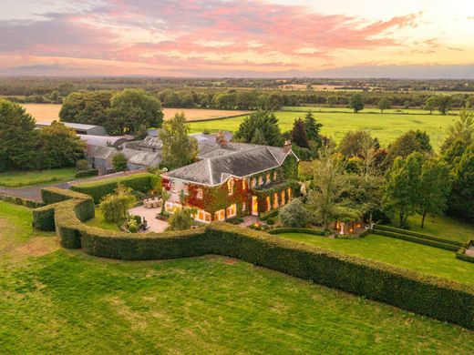 Une élégante et charmante maison de campagne de style géorgien, nichée au cœur de magnifiques jardins paysagers. Proposée à la vente avec 11,3 hectares de terres fertiles destinées à l'élevage de chevaux, ou avec un total de 45,3 hectares. Mount Prospect Stud est une demeure de prestige. Une allée bordée d'arbres mène à une belle façade, élégamment recouverte de lierre de Boston. La maison, d'une superficie d'environ 571 mètres carrés répartis sur deux niveaux, a bénéficié d'importants travaux de rénovation et d'agrandissement ces dernières années, offrant un intérieur moderne, confortable et lumineux. Titulaire d'un ancien haras prospère, la propriété comprend des terres fertiles, une cour d'écuries d'origine avec de belles dépendances en pierre et un pavillon avec une cour d'écuries moderne attenante. La porte d'entrée, encadrée d'un chapiteau à colonnes et surmonté d'une grande imposte géorgienne, s'ouvre sur le hall d'entrée d'origine. Le hall d'entrée dessert le salon, la salle à manger et la salle familiale, chacun doté d'une cheminée. Le salon communique avec une petite antichambre pouvant servir de bureau. Le hall donne accès à un escalier intérieur desservant le premier étage et la cuisine. Véritable cœur de la maison, la cuisine est spacieuse et entièrement équipée, avec une cuisinière Aga, un grand îlot central et un coin repas baigné de lumière. Elle communique avec un porche et une porte extérieure, une grande buanderie, un cellier et la véranda. De grandes fenêtres et de larges portes-fenêtres doubles donnant sur un hall exposé plein sud, attenant à la salle familiale, laissent entrer une belle lumière naturelle. La véranda, baignée de soleil, est un espace de vie remarquable et polyvalent, comprenant un salon, un bureau et une bibliothèque. Elle offre une vue panoramique imprenable sur la terrasse et les jardins, estompant la frontière entre confort intérieur et beauté extérieure. À l'étage, les chambres sont spacieuses et accueillantes. La suite parentale est particulièrement impressionnante, avec ses deux dressings et sa luxueuse salle de bains privative. Une deuxième suite parentale dispose d'une salle de douche attenante. La maison comprend également trois autres chambres, une salle de bains familiale, une salle de sport et un sauna. Dans toute la demeure, une décoration somptueuse est sublimée par une abondante lumière naturelle et offre une vue sur le jardin depuis chaque pièce. Les détails architecturaux abondent, notamment la magnifique baie vitrée cintrée qui inonde de lumière naturelle la cage d'escalier et le couloir, soulignant l'élégance intemporelle qui caractérise cette remarquable maison. Les jardins sont absolument enchanteurs et ont récemment accueilli un mariage sous chapiteau (225 convives). Une généreuse terrasse longe les façades sud et ouest de la maison. Bien abritée, elle constitue un superbe espace de réception et communique directement avec la salle familiale. Le pavillon, situé dans l'ancienne cour des écuries, s'étend sur 174 mètres carrés et comprend quatre chambres. À l'instar de la cour des écuries, il possède un charme indéniable, mais les deux bâtiments nécessitent d'importants travaux de rénovation. La cour d'origine compte 20 boxes, dont deux boxes de poulinage et des remises à fourrage, tandis que la cour des écuries plus moderne comprend 15 boxes et un grand hangar de stockage. Les deux cours, d'origine et plus récente, sont accessibles par la route. Ces terres, actuellement exploitées comme haras, bénéficient d'une situation exceptionnelle au cœur du comté de Kildare, région emblématique de la tradition équestre irlandaise. Nichées au centre de la prestigieuse communauté irlandaise d'élevage et de courses hippiques, et à proximité de centres d'excellence pour toutes les disciplines équestres, elles offrent une opportunité unique aux passionnés d'équitation. Proposées à la vente en parcelles de 28 acres, elles peuvent toutefois être acquises jusqu'à 112 acres. La ville voisine de Rathangan est jumelée avec Freehold Borough, ville natale de Bruce Springsteen dans le New Jersey, en hommage à son arrière-arrière-grand-mère originaire de Rathangan. Le Grand Canal traverse Rathangan et fait partie de la Barrow Blueway, un itinéraire de randonnée et de cyclisme très apprécié. Le Curragh à 12 miles (20 km), l'aéroport de Dublin à 56 minutes en voiture, Rathangan à 5 minutes en voiture (1,9 miles ou 3,1 km), le K-Club Golf and Hotel Resort à 36 minutes en voiture, Kildare Retail Village à 12 minutes en voiture.