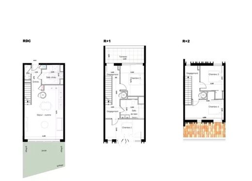 Le rez-de-jardin comprend un séjour avec cuisine ouverte donnant accès directement au jardin de 20m2. Salle d'eau et toilettes indépendants accompagnent cet espace.