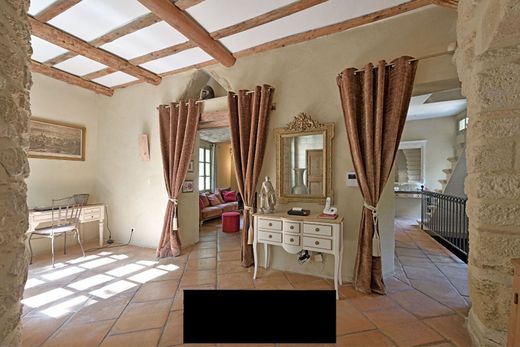 À deux pas d'Uzès, nichée dans un village paisible où le temps semble suspendu, cette demeure en pierre d'environ 365 m² déploie son charme d'antan autour d'une cour ensoleillée, agrémentée d'une terrasse, d'une piscine et d'un jardin suspendu. Derrière une petite cour d'entrée discrète, une porte franchie comme un seuil, le regard se porte immédiatement sous les majestueuses voûtes d'une ancienne étable réinventée en vaste séjour. Là, la pierre brute dialogue avec une cheminée presque sculptée dans la roche, et la lumière, douce et fluide, se diffuse au cœur de ses 59 m². L'atmosphère est saisissante : à la fois majestueuse et profondément accueillante. Un peu plus loin, un second séjour intime, coiffé d'un plafond voûté en parapente, abrite une cheminée, tel un cœur battant dans la pierre. Il s'ouvre d'un côté sur une double cuisine baignée de lumière grâce à sa triple exposition, son îlot central en bois et sa plaque de cuisson, et de l'autre sur la terrasse. La salle à manger attenante, délimitée par une arche en pierre, s'ouvre généreusement sur l'extérieur et prolonge l'expérience de la maison vers le ciel. À l'étage supérieur de l'aile sud, la suite parentale s'étend sur 46 m². Une chambre à triple exposition ouvre ses fenêtres sur le murmure des pierres et la douceur d'une terrasse couverte. Un couloir bordé de rangements mène à un bureau, puis à une salle de bains où une baignoire sur pieds, une douche à l'italienne et un lavabo en pierre créent une ambiance intemporelle, presque romantique. Plus haut, deux chambres se partagent un étage. L'une d'elles, prolongée par une terrasse suspendue, offre une vue à l'ouest sur laquelle le soleil couchant embrase chaque soir. Une salle de bains aux lignes simples et élégantes complète discrètement ce niveau. Dans l'aile ouest, accessible indépendamment, les deux premières chambres du premier étage donnent sur la cour et les toits du vieux village, chacune avec sa propre salle de bains. À l'étage supérieur, deux autres suites séparées par une terrasse couverte s'ouvrent sur l'infini. De là, la vue embrasse la campagne jusqu'au Mont Ventoux, dans une profondeur de champ presque picturale. Chaque pièce est conçue comme un refuge : volumes généreux, matériaux nobles, espace aéré. Le jardin suspendu, un peu à l'abri des regards, est un havre de paix où l'on vient lire, rêver ou simplement se ressourcer en silence. En contrebas, la cour principale, d'environ 162 m², s'anime de petits recoins, d'ombres douces et d'espaces baignés de soleil. Une salle à manger d'été, un solarium et une piscine aux lignes épurées créent un cadre de vie extérieur riche, fluide et inspirant. Un atelier, une cave à vin, un cellier, un local à vélos et un garage pour deux à trois voitures complètent l'ensemble. Chauffage au sol électrique côté sud, radiateurs au fioul côté ouest, double vitrage : rien n'a été laissé au hasard. Cette maison raconte une histoire. Celle de vieilles pierres, d'un silence habité et d'un art de vivre que le temps ne peut altérer. Située à 4 kilomètres d'Uzès, à 30 minutes de la gare TGV d'Avignon, à 28 kilomètres de Nîmes et à 19 kilomètres de l'autoroute. Uzès — Joyau du sud de la France, Uzès enchante par son riche passé, son architecture raffinée et son art de vivre provençal. Premier duché de France, la ville offre d'élégantes places, des cafés ombragés et des marchés animés, entourés de vignes et de champs de lavande. Un cadre idéal pour les acquéreurs en quête d'un charme intemporel, d'une richesse culturelle et d'une atmosphère à la fois paisible et dynamique, au cœur de la Provence authentique.