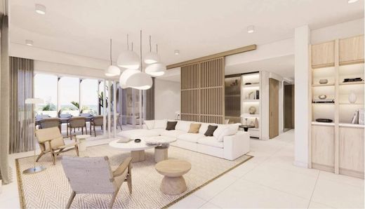 Situé au dernier étage, ce penthouse développe des volumes généreux, des espaces de vie lumineux et une vue dominante sur les jardins tropicaux et l’environnement côtier. Il comprend :