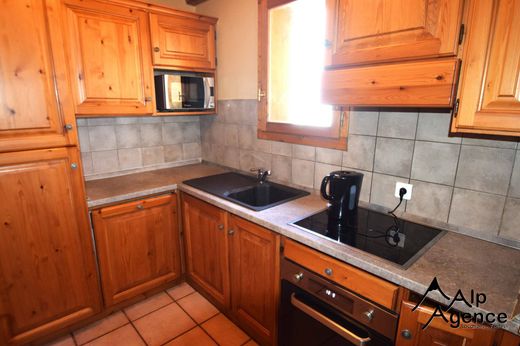 Il est équipé style 'chalet' : un esprit savoyard avec cheminée, ameublement de montagne, et comprend : un séjour ,4 chambres, 3 salles de bains, le tout très bien distribué sur 3 niveaux.