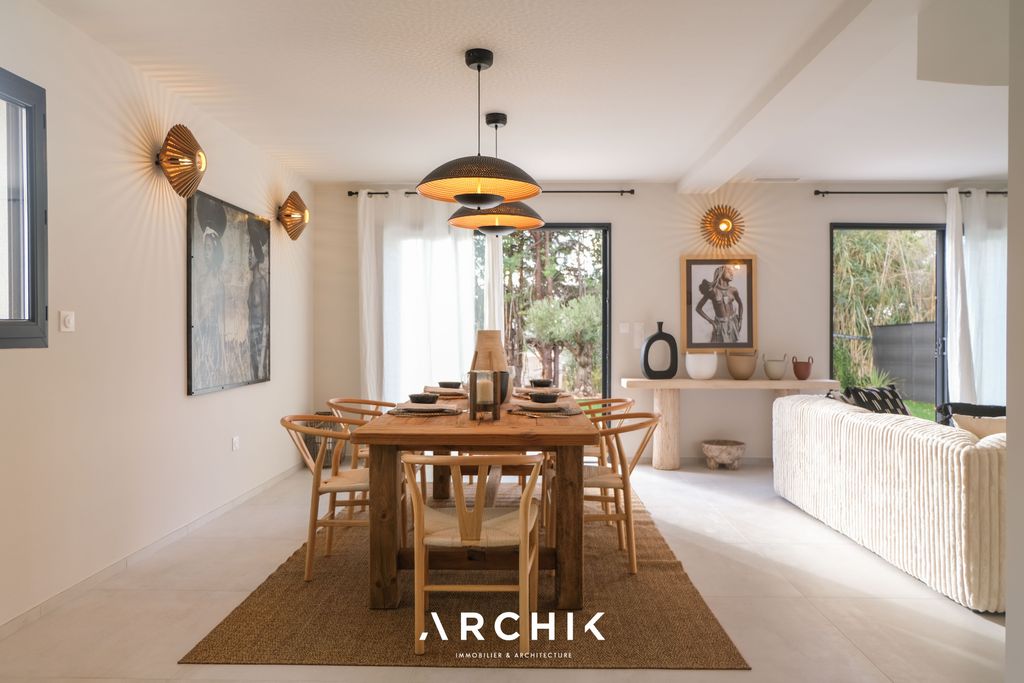 Habillée par le décorateur d’intérieur Philippe Puron, la maison dévoile un style singulier, bohème et raffiné. Pensée comme un lieu de vie clé en main, elle est entièrement aménagée et meublée, et se déploie sur deux niveaux aux volumes généreux. Au rez-de-chaussée, l’espace de vie s’organise autour d’un salon, d’une salle à manger et d’une cuisine ouverte, prolongés par une salle d’eau et un espace buanderie. Les grandes dalles de carrelage gris ciment associées à des tons clairs sont soulignées par des huisseries noires, affirmant une écriture contemporaine. Deux larges baies vitrées offrent un accès direct au jardin et instaurent un dialogue permanent entre intérieur et extérieur. La cuisine, véritable pièce maîtresse, joue sur les contrastes entre façades blanches épurées, chaleur du bois et profondeur du noir marbré. À l’étage, quatre chambres composent l’espace nuit, dont une suite parentale avec salle de bains habillée d’un carrelage façon terrazzo et d’un meuble vasque maçonnée. Chaque chambre bénéficie de rangements sur mesure et d’une atmosphère qui lui est propre, à la fois chic et confortable. Une seconde salle de bains, revêtue d’un carrelage aux différentes tonalités de gris, est sublimée par un meuble vasque en bois au dessin rétro. À l’extérieur, une terrasse prolonge naturellement les espaces de vie et s’ouvre sur un jardin paysagé, pensé comme un écrin de verdure propice à la détente.