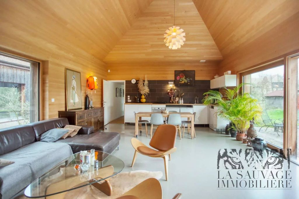 Dès l’entrée, le ton est donné : une spectaculaire pièce de vie cathédrale de 51 m², intégralement habillée de sapin clair, baignée de lumière grâce à ses vastes baies vitrées ouvertes plein sud sur le jardin et la forêt. Une seconde façade vitrée s’ouvre sur une cour intérieure arborée, tandis qu’une baie zénithale capte la course du soleil. Cet espace réunit salon, salle à manger et cuisine américaine dans une ambiance chaleureuse, évoquant un chalet contemporain.