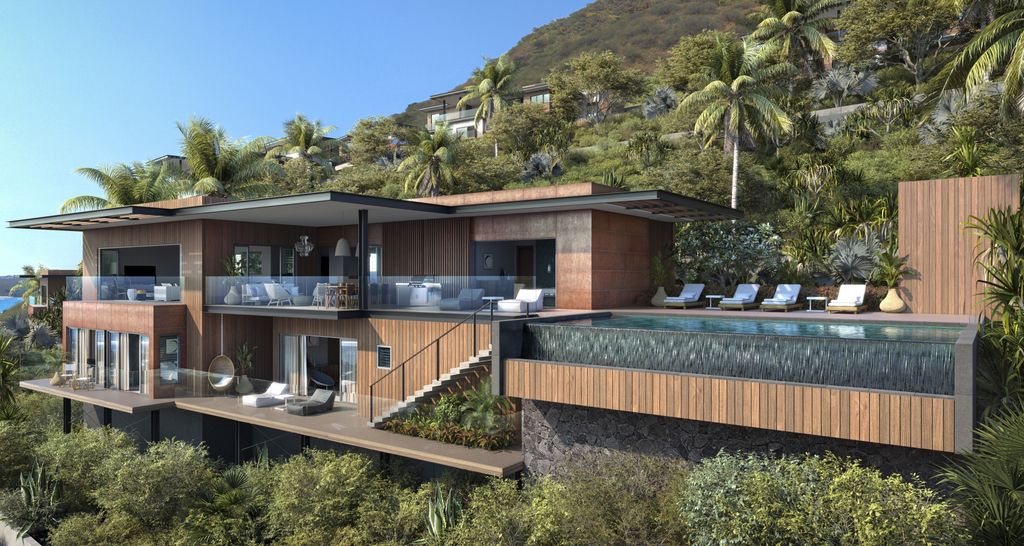 Niché à l’ouest de l’île, dans un coin sauvage protégé du vent, cette somptueuse villa située dans un resort d’exception promet une expérience de vie unique. Édifiée sur un terrain de 1 002 m2, elle offre une superficie totale de 455,1 m2, comprenant une vaste terrasse et une piscine à débordement privative.