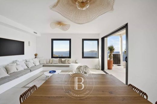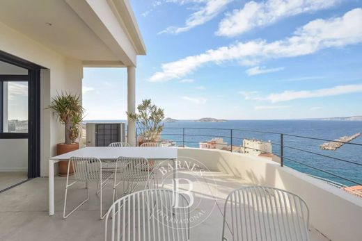 Dès l'entrée, découvrez une ambiance lumineuse et aérée. La pièce de vie principale, dotée d'une cuisine entièrement équipée avec un îlot central, s'ouvre sur un salon raffiné donnant accès à une vaste terrasse offrant une vue panoramique à 180 degrés sur la mer, les îles, l'Église St Eugène et la plage des Catalans. Cette terrasse extérieure bien aménagée propose un espace cuisine, un salon d'été et une élégante salle à manger.