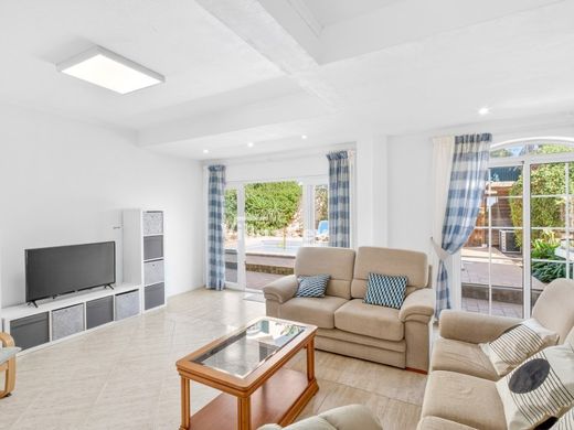 Au rez-de-chaussee, la villa dispose d'un espace de vie ouvert comprenant un salon et une salle a manger, donnant sur le jardin, le barbecue et la piscine. On y trouve egalement une cuisine separee equipee d'appareils Siemens, une salle de bains et un cellier tres pratique.
