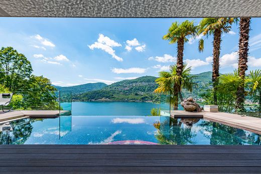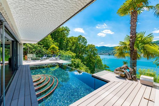 A Montagnola, in Collina d'Oro, in quartiere residenziale tranquillo, orientata ad ovest con splendida vista sul lago di Lugano e le montagne circostanti, sorge questa splendida villa moderna. Con 4637 mq di terreno (di cui 3511 mq di bosco e 50 mq di particella a lago), un giardino piantumato con ulivi, palme e fiori di vario tipo; la privacy è garantita. Dista ca. 10 minuti d'auto dal centro di Lugano e dalla TASIS (American School). La proprietà è stata completamente rinnovata nel 2013/2016 con materiali ricercati e rifiniture di altissimo standing e mantenuta in uno stato impeccabile. Offre circa 440mq abitativi su 3 piani e ulteriori 400mq di terrazze (con infinity pool riscaldato, cucina, BBQ, pergola di Pininfarina) nonché un appartamento ospiti indipendente e una darsena . L'abitazione offre il non plus ultra per quanto riguarda il comfort abitativo utilizzando le tecnologie di ultima generazione. Gli spazi abitativi della villa sono così suddivisi: piano d'entrata: atrio d'ingresso, bagno di servizio, cucina accessoriata, sala da pranzo, ampio soggiorno, 2 camere ognuna con guardaroba e bagno en-suite, patio, terrazze, giardino; piano inferiore: bagno di servizio, camera padronale con guardaroba e bagno en-suite, soggiorno, zona fitness con sauna e doccia, lavanderia, terrazza con infinity pool, giardino; appartamento ospiti: 3 camere con propri bagni en-suite. Posti auto: 2 interni (garage), 2 esterni. Questa villa moderna rappresenta il massimo che la tecnologia odierna possa offrire, garantendo eleganza, privacy e comfort abitativo.