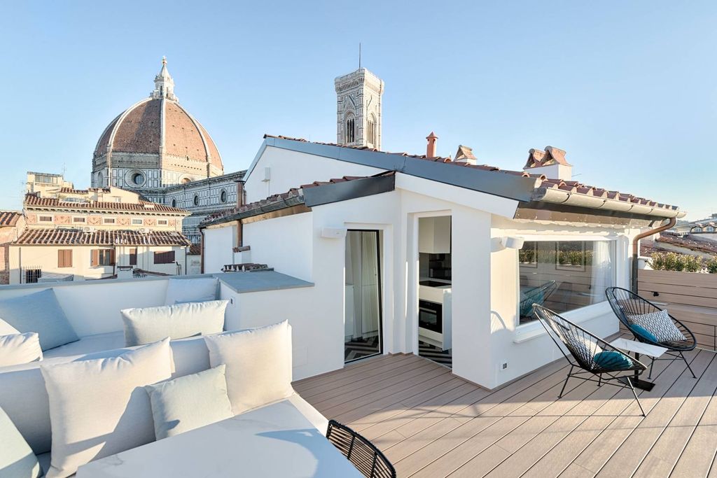 La terrazza privata offre una vista a 360 gradi sui tetti di Firenze e vi affascinerà con il suo panorama privilegiato. Qui potrete rilassarvi o godere una cena a lume di candela.